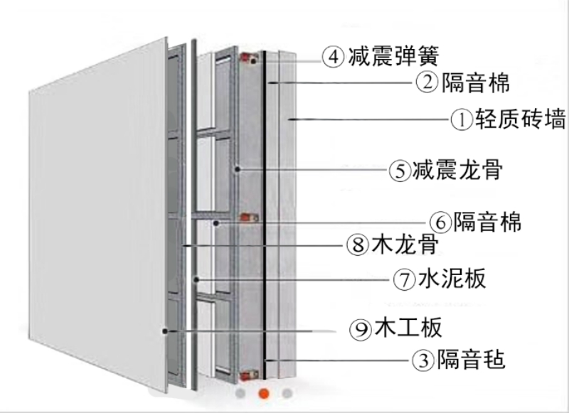 演播室使用240mm厚砖墙已可以满足隔声设计要求,为了填重起见,在演播室的内墙面贴上50mm厚的隔声泡沫板,以增大墙体的隔声量。