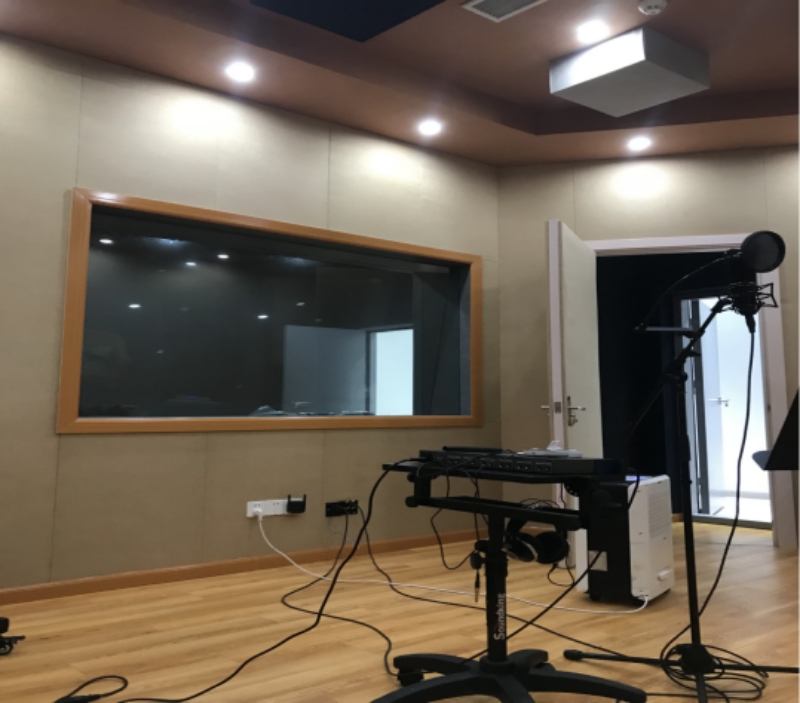 为了隔绝空气声,该演播室不开设直接通向室外的窗口,导播室的观察窗采用三层中空玻璃窗,窗口的隔声量主要取决于玻璃,中低频时玻璃的隔声量由密度决定,故最好选用厚一点的玻璃板。