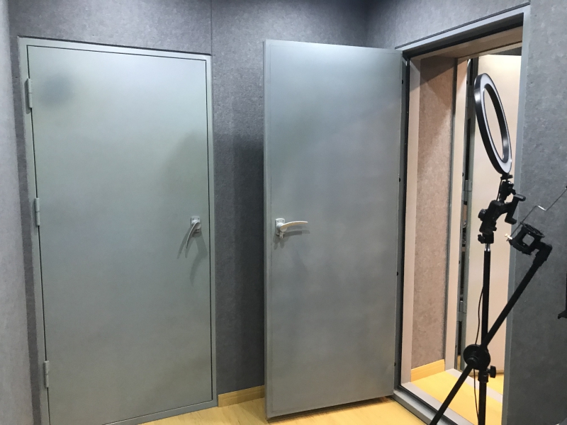 为了能够起到一个很好的录音效果,演播室门需要用梯形处理工艺,高密度材质才能保证达标的隔音效果。正常我们会使用钢制隔音门,锁使用隔音门压紧锁。隔音量在40-45db。